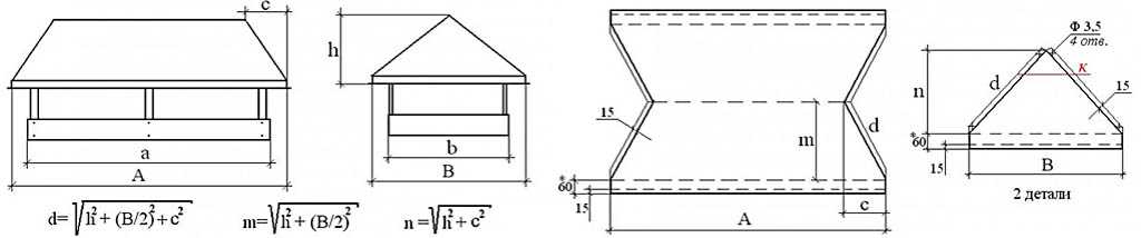 Как и в предыдущем варианте, первым делом надо снять наружные размеры кирпичного дымохода, а затем рассчитать и зарисовать выкройку, как показано на чертеже. Здесь же приведены формулы для определения длины сторон элементов в зависимости от исходных габаритов трубы и высоты флюгарки.