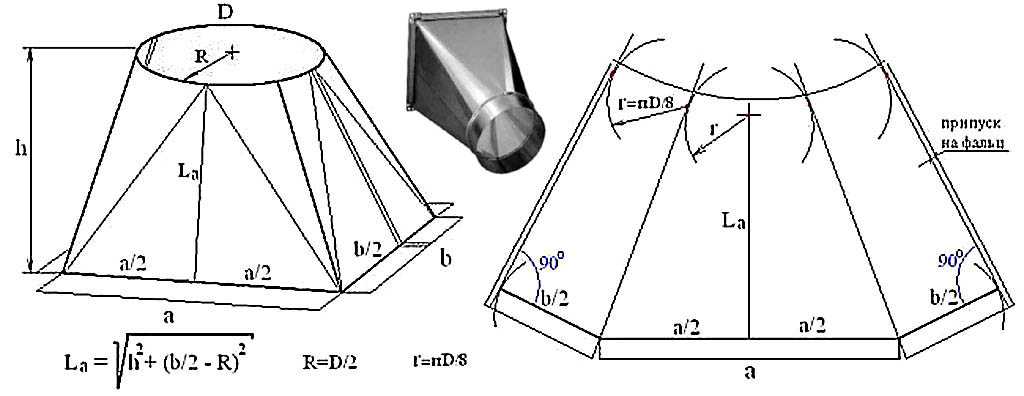 Построение развертки (выкройки) перехода с квадрата на круг (круг внутри) для диффузора (юбки) дефлектора дымовой трубы