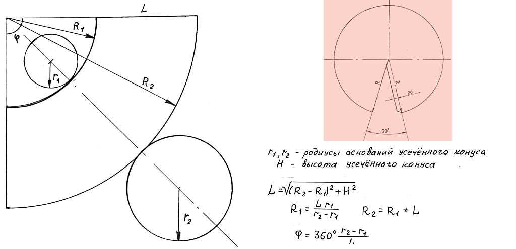 Обратите также внимание на врезку, отмеченную красным: это развертка того самого конуса Григоровича. Образующий угол (в данном случае 30 градусов) находится как φ = arcsin(H/r), где H – высота конуса, а r – радиус основания
