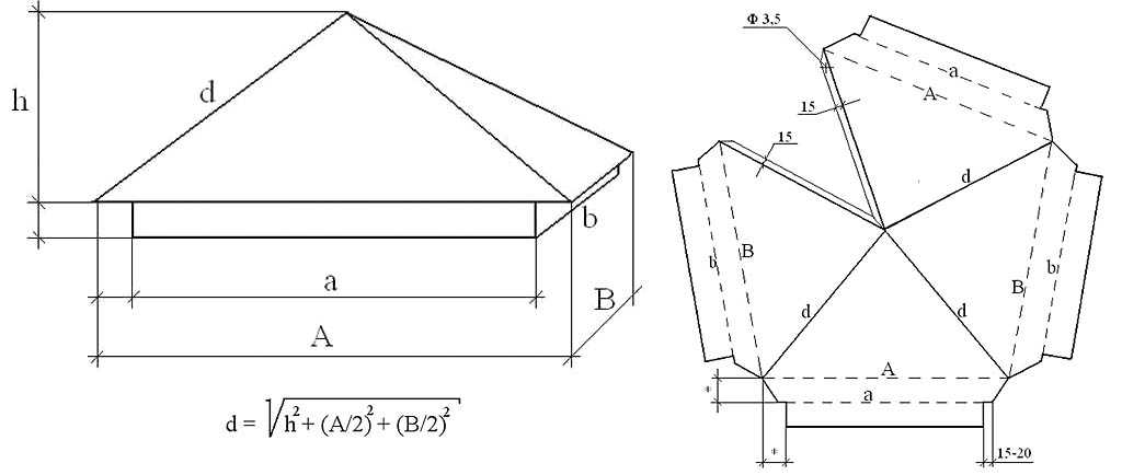 Для изготовления этой разновидности колпаков желательно воспользоваться станком — листогибом или обратиться за данной услугой в соответствующую мастерскую. В крайнем случае придется гнуть элементы вручную по линии, аккуратно пристукивая металл резиновым молотком на деревянном бруске.