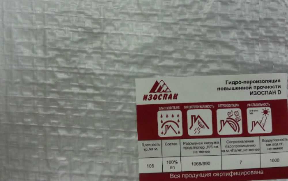 Представляет из себя полипропиленовую основу с односторонним заламинированным покрытием из пленки полипропилена. Данный материал используется в строительных работах для обеспечения защиты конструкций от попадания паров влаги и конденсата. Благодаря своей высокой прочности этот материал может выдержать значительные механические нагрузки в процессах монтажа, и может нести значительную снеговую нагрузку. Материал используется в качестве универсальной пароизоляции в случаях, когда просто необходимо защитить различные элементы конструкции внутри помещений. Применяется в процессе подкровельной гидроизоляция в кровлях без утепления и для защиты элементов конструкции из дерева от снега, ветра и влаги в местах, где кровля неплотно прилягает. В стяжках из цемента “Изоспан D” используется как прослойка гидроизоляции при устройстве пола в подвалах и помещениях с высокой влажностью.
