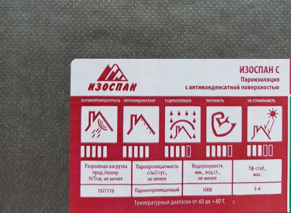 - Пароизоляционная пленка с функцией гидро- и ветрозащиты. Это универсальный материал, который может защитить конструкцию от большинства неблагоприятных внешних факторов: влаги, ветра снаружи; конденсата изнутри. Пароизоляция изоспан действует только в одну сторону: пропускает влагу из помещения, но препятствует проникновению осадков и ветра с улицы. По этой причине материал называется гидроизоляционной ветрозащитной паропроницаемой мембраной. К данной группе относят покрытия вида А.