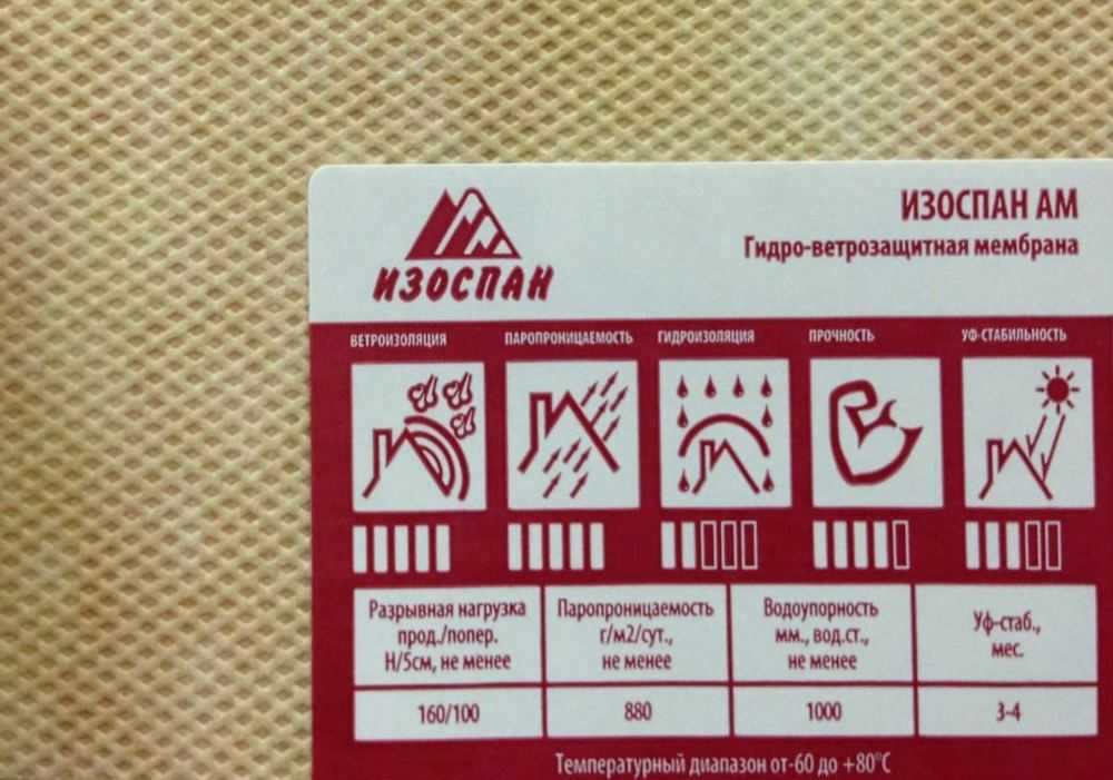- Изоспан AS. Технические показатели: плотность – 115 г/кв. м, паропроницаемость – 1000 гр./кв. м/сутки. Трехслойный диффузный материал, более стойкий к растяжению, чем тип АМ.