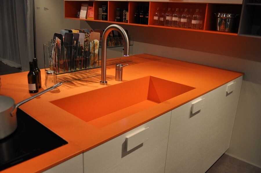 подстольные — современный вариант установки, при котором мойка будет немного ниже столешницы. Торцы рабочей зоны находятся под постоянным воздействием воды, поэтому нужно выбирать устойчивые к влаге материалы, МДФ и ДСП не подходят, предпочтительны стекло или камень.