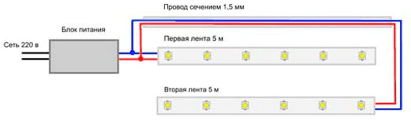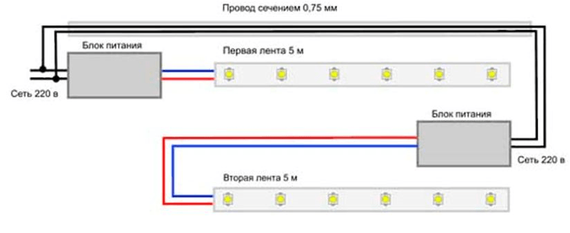 ленты свыше 5 метров необходимо использовать отдельные параллельные подключения