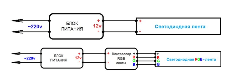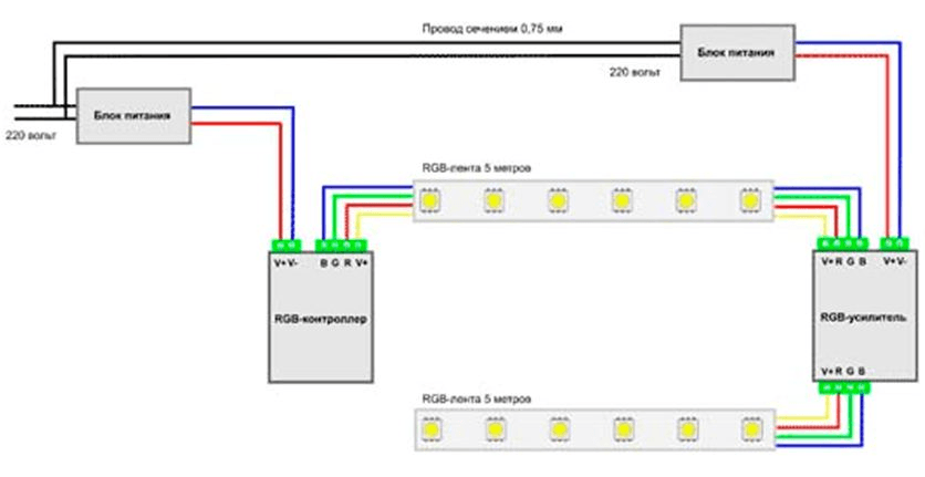 При покупке светодиодной ленты необходимо произвести расчёт её мощности и подобрать соответствующий блок питания. Если такого не найдётся – устанавливается два блока питания. Каждые пять метров ленты подключаются отдельно к источнику питания, данный тип подключения указан ниже (случай для двух блоков питания). Не подключайте более пяти метров ленты последовательно.