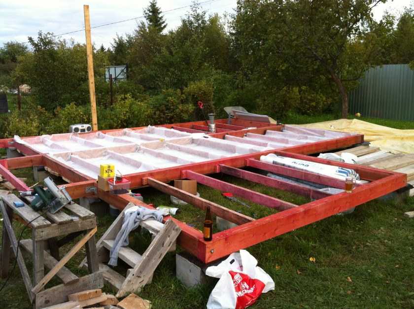 Все части каркаса нужно собрать, выставить по уровню и соединить. Между стойками выкладывается утеплитель и гидроизоляция.