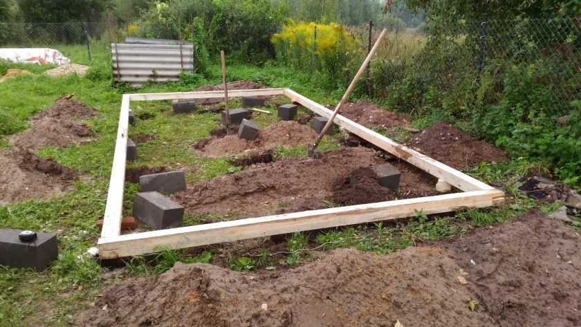 Если решено ставить каркасную баню, достаточно будет сделать небольшой ленточный фундамент. Для его обустройства на подготовленной ровной поверхности устанавливают квадратную опалубку из 2-х параллельно расположенных досок. Их скрепляют с помощью саморезов, дополнительно используют поперечины, чтобы впоследствии уложить брусок.
