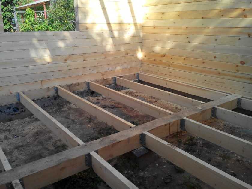В стене с проемом по проекту шаг стоек нужно увеличить на 40 см. В местах примыкания рамы к перемычкам устанавливаются дополнительно стойки. Одновременно с монтажом каркаса стен можно выполнять установку лагов для пола. Материал – доска 150х50 мм.