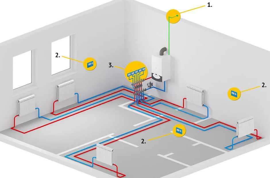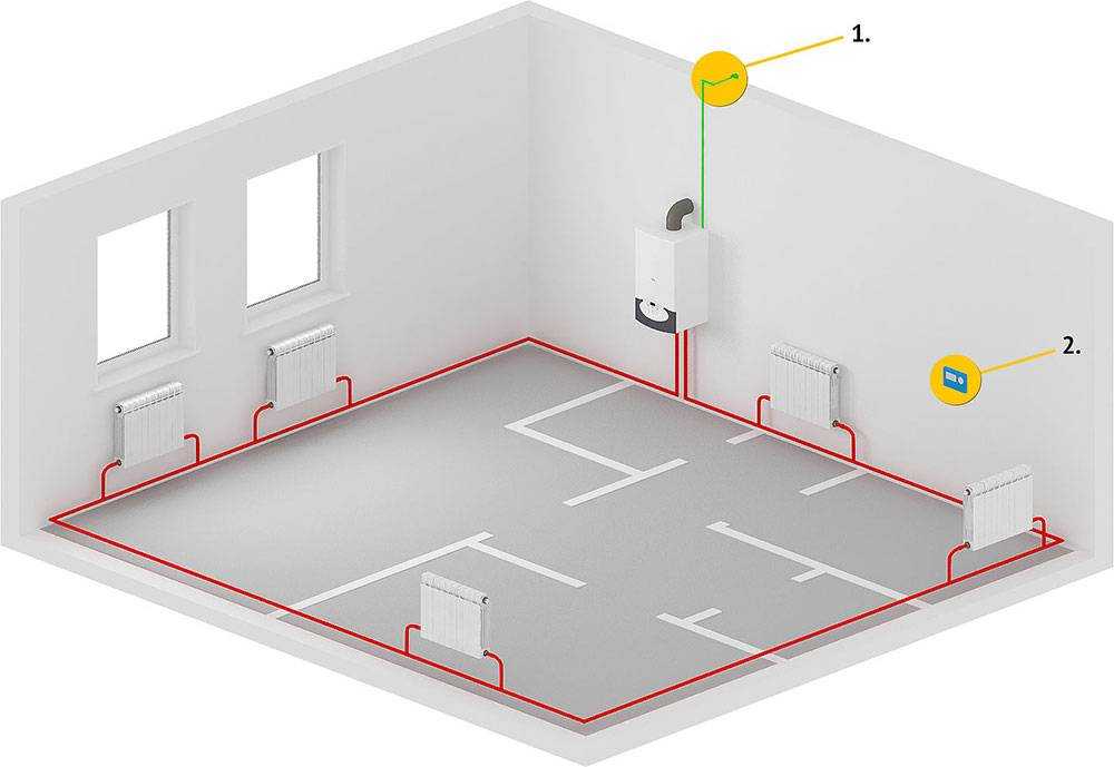Для распределения тепла по контурам отопление разбивают на участки. Например, это может быть теплый пол, батарея у окна, второй теплый пол на верхнем этаже. Нужно сделать замкнутую возвратную систему.