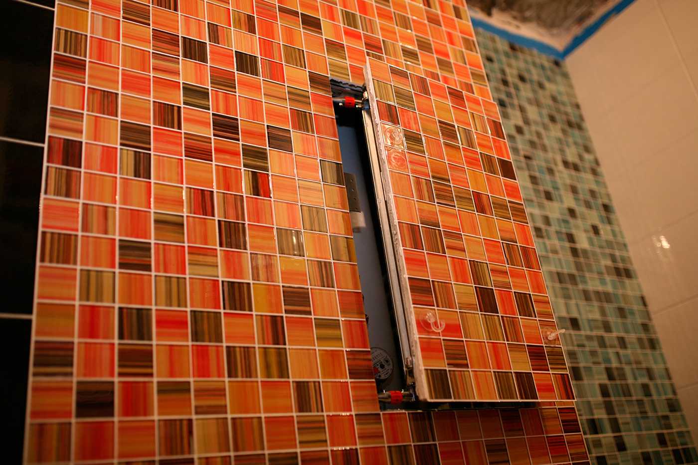 Их рассчитывают в зависимости от выбранной плитки: нужно, чтобы при открывании дверцы не цеплялись друг за друга, но при этом были красиво оформлены отделочным материалом.