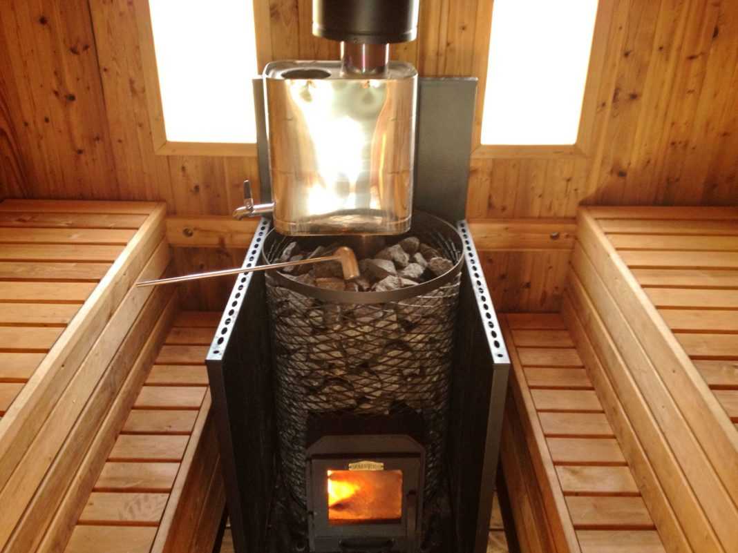 - Твердотопливная печь. Широко распространено отопление бани печью на твердом топливе. Она хороша для парилки, но требует постоянного подбрасывания топлива. Для дачного участка, посещаемого раз в неделю, такой вариант не подойдет, придется потратиться на электрический подогреватель.