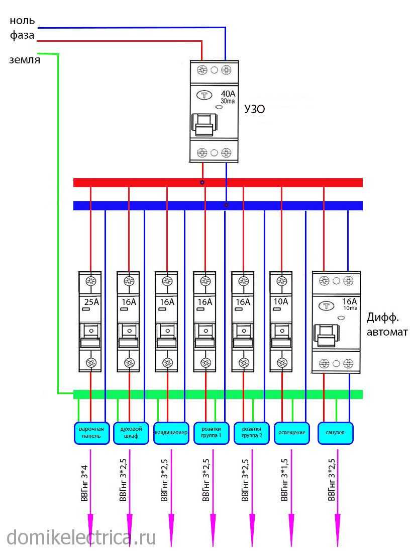 В современных схемах входной автомат ставят двухполюсный: он должен одновременно отключать оба провода (фазу и ноль), чтобы в случае неисправности полностью обесточить сеть: так безопаснее и таковы последние требования по электробезопасности. Тогда схема включения УЗО и выглядит так, как на фото ниже.