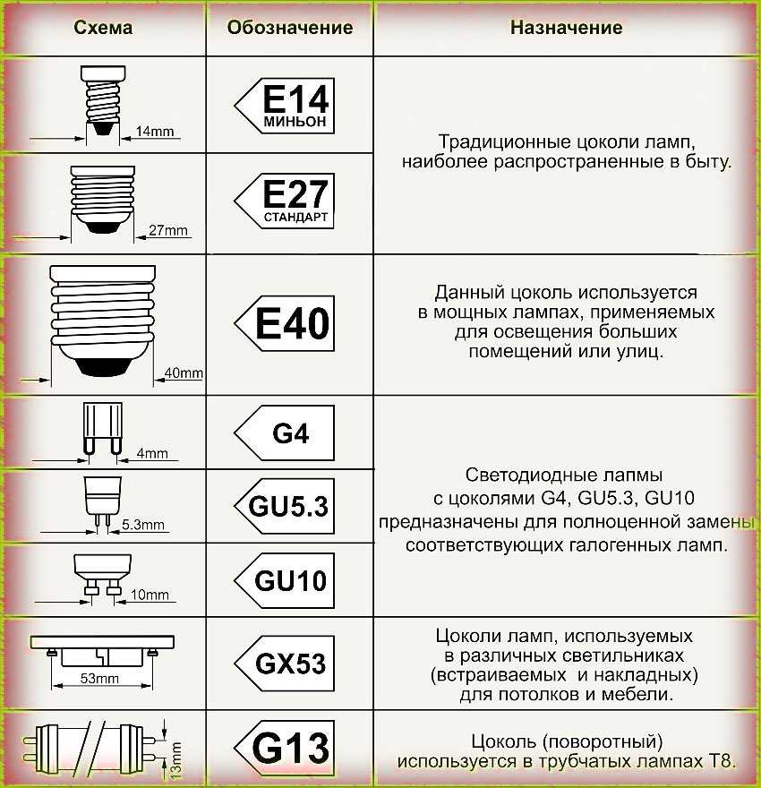 4. Цоколь. LED-лампы выпускаются с винтовым (Е) или штырьковым (G) цоколем, каждый из которых имеет свои особенности: