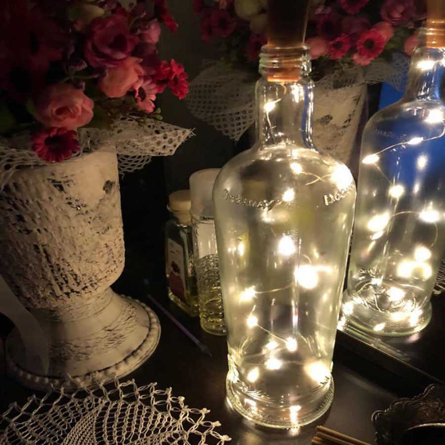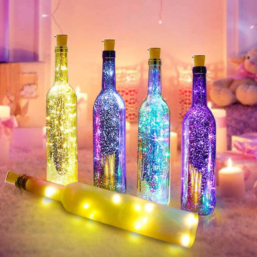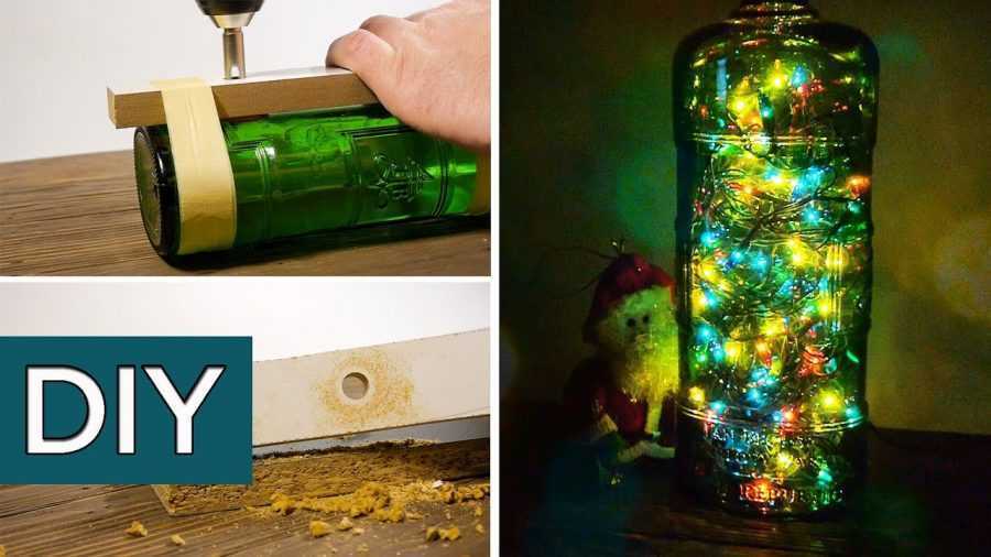 После получения отверстия, продевается гирлянда, но только осветительная часть. Также необходимо учесть, что лампочки сильно нагреваются, поэтому используется гирлянда с LED – лампами. Регулятор остается снаружи и устанавливается на бутылку двухсторонним скотчем, для удобства.