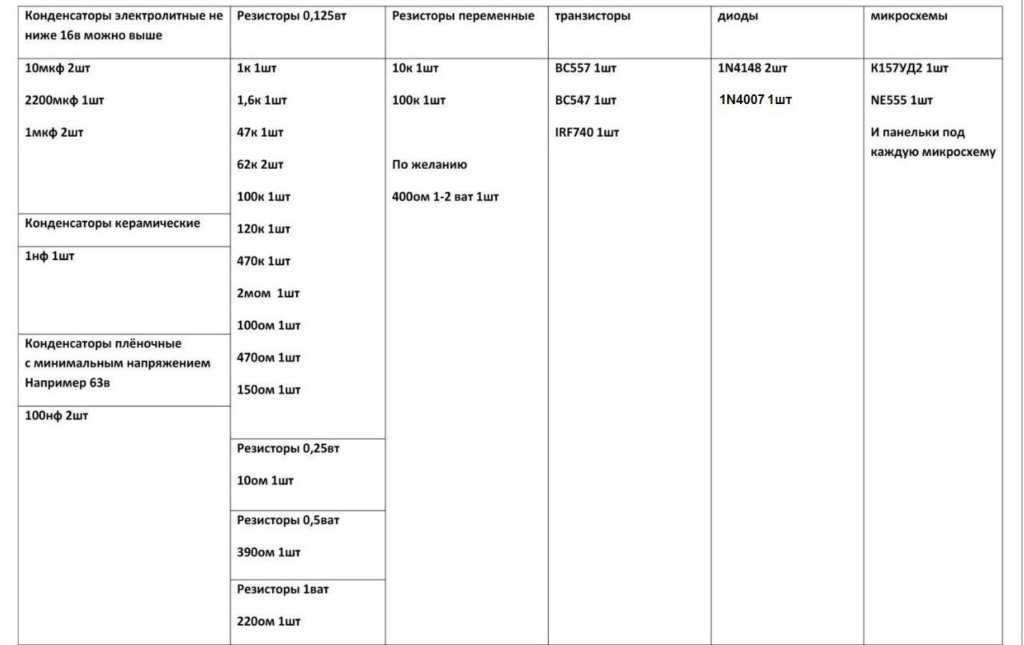 Далее приступаем к работе начиная вставлять резисторы, диоды и перемычку. Весь список радиодеталей приведён на картинке выше.