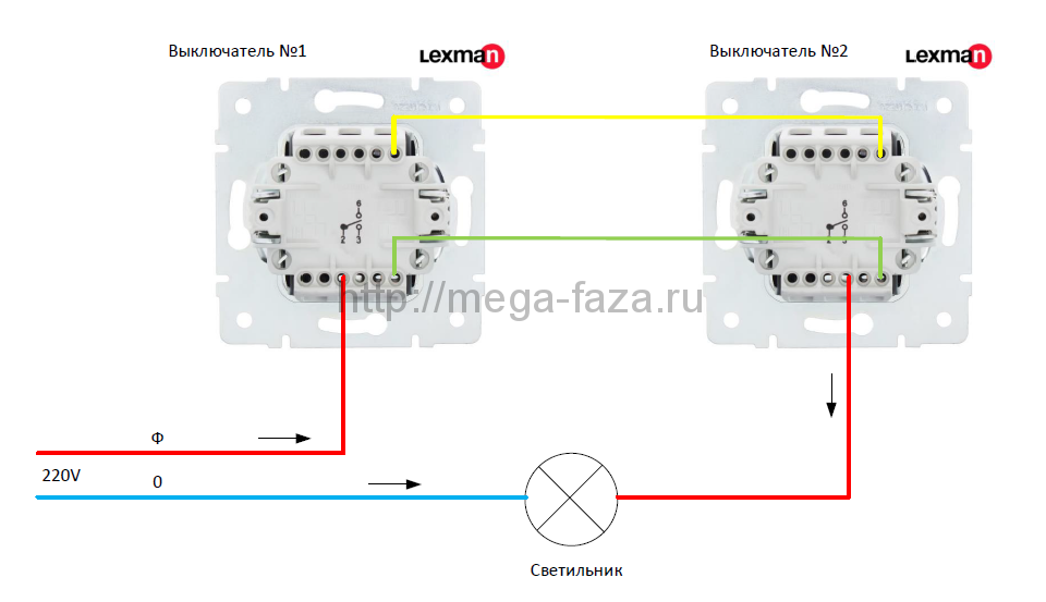 Для включения осветительных приборов из двух мест собирается система из двух проходных одноклавишных выключателей и проводников необходимой длины. К осветительному прибору подводится нулевой провод. А к первому выключателю, на его входной контакт, подводят фазу. Два контакта выхода первого выключателя соединяются с двумя выходами второго выключателя. А от входа второго выключателя тянут фазу к осветительному прибору.