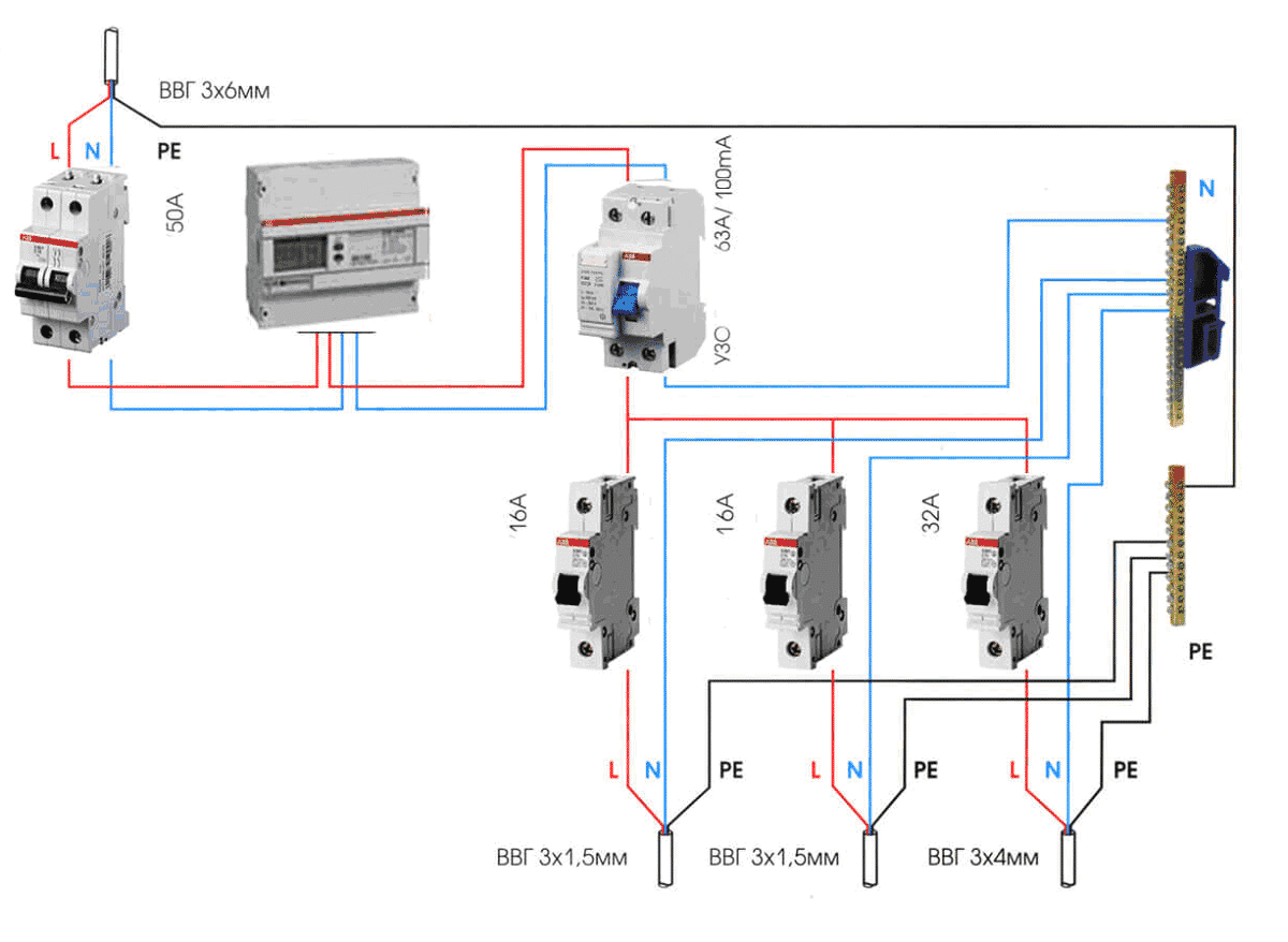 Подобная схема собирается в трехфазном распредщите, где находятся: