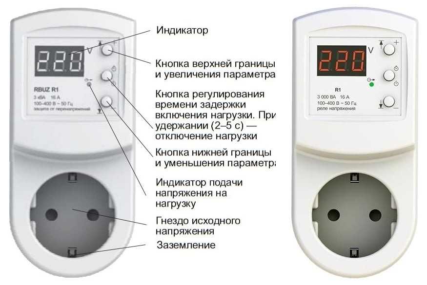 - Устройство для защиты бытовой розетки, которое оснащается штепсельными контактами. Изделие представляет собой переходной узел, внутри которого расположены измерительный прибор, контроллер и контактная группа. Детали установлены в пластиковом корпусе, на внешней стороне предусмотрено гнездо для подключения внешних потребителей. В конструкции изделия предусмотрены поворотные регуляторы или кнопки, позволяющие выставить рабочие параметры. Устройства рассчитаны на мощность до 3,5 кВт (сила тока до 16 А).
