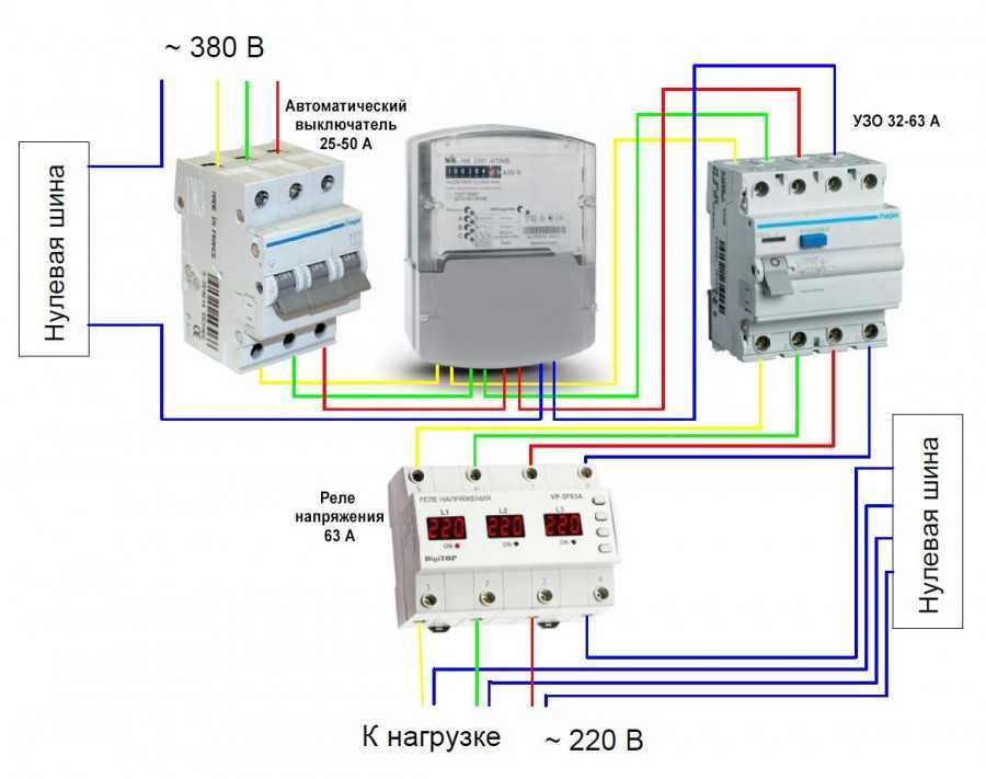 Поэтому при выборе реле напряжения по мощности следует учитывать номинал установленных автоматических выключателей в доме и потребляемую нагрузку. Если стоят автоматы на 25А, то потребуется реле напряжения на 32-40А, чтобы защитить весь дом. Иногда требуется выбрать реле напряжения и мощнее, например, на 50-63А, здесь все во многом зависит от того, какая нагрузка к нему будет подключена.