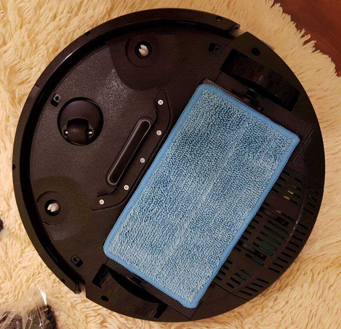 Внизу на корпусе находятся 2 ведущих колеса, ролик спереди, 2 щетки по бокам, отверстие для всасывания пыли. Кроме того, расположены контакты для подзарядки, отсек батареи, место для фиксации насадки с влажными салфетками из микрофибры.