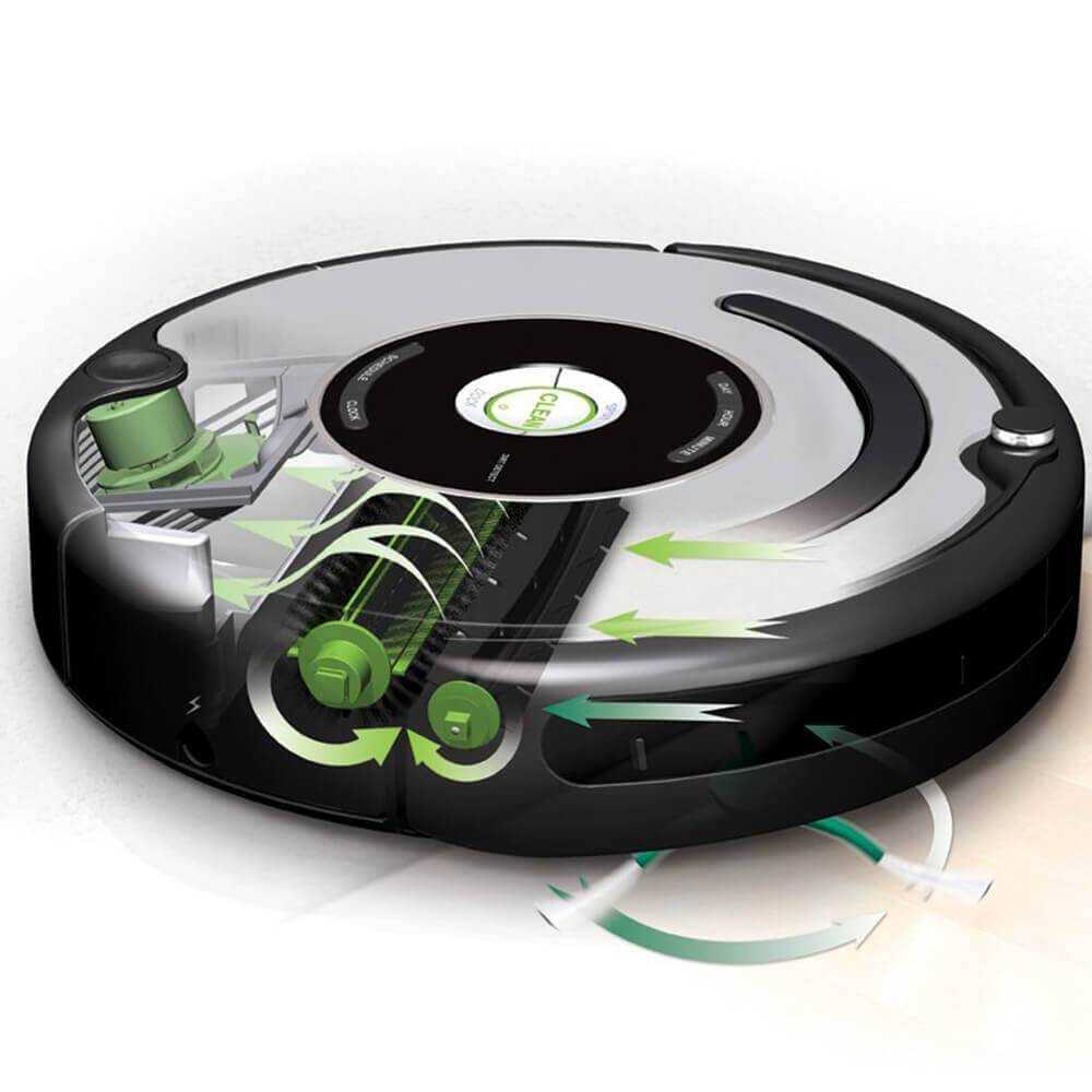 Теперь перейдем к iRobot Roomba 616. У него четыре режима уборки: по периметру, зигзагом, вдоль стен и перпендикулярно стенам. В роботе-пылесосе присутствует функция холостой прокрутки колес, благодаря чему Айробот не запутывается в проводах и прочих вещах. Помимо этого следует выделить более качественную систему щеток: 2 основных щетки и 1 боковая, что положительно влияет на эффективность сбора мусора.