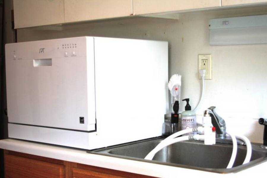 Проще всего организовать слив из настольной ПММ. Для этого достаточно прикрепить сливной шланг к раковине мойки