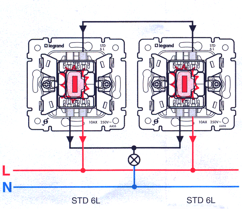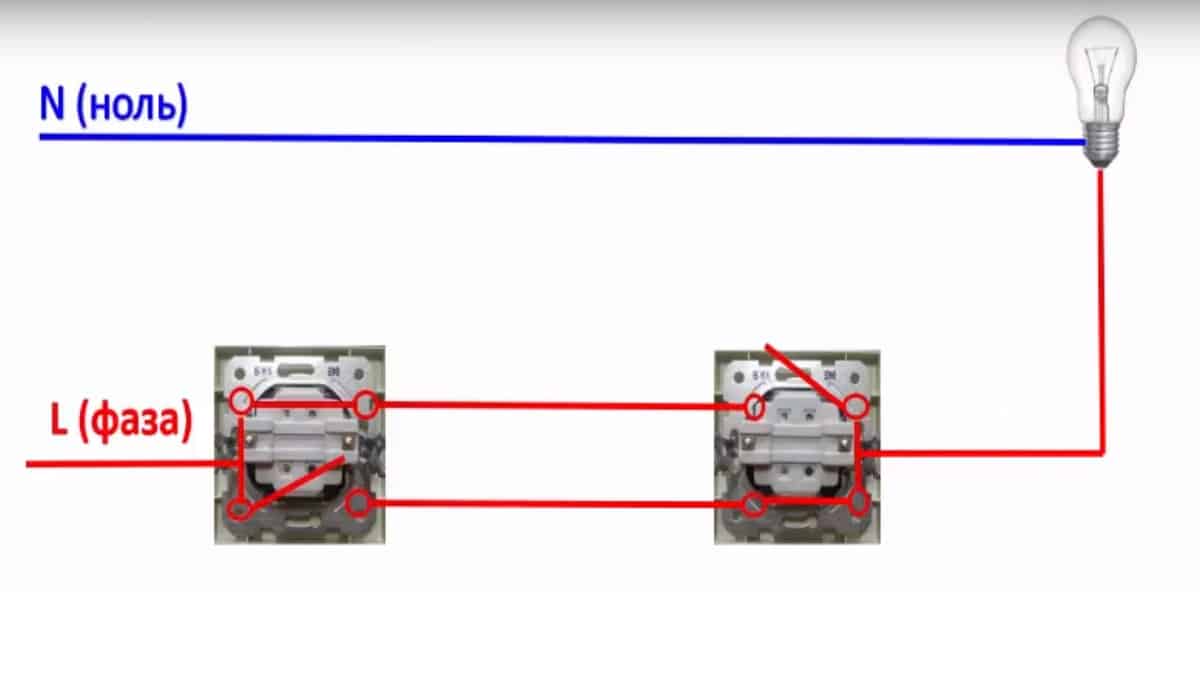 Как подключить проходной выключатель с двух точек полная схема монтажа