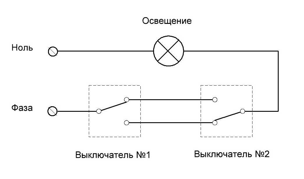 Для управления одним световым прибором из разных точек помещения используется минимум два проходных выключателя. Когда изменяется положение клавиши – цепь замыкается, лампочка загорается. При выключении любого из двух переключателей цепь размыкается, светильник гаснет. Таким образом, когда клавиши проходных переключателей находятся в одном положении – свет горит, когда в разном – гаснет.