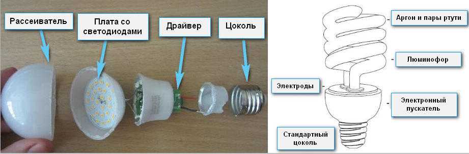 В качестве светоизлучателя у LED используются светодиоды открытой конструкции либо помещённые в пластиковую колбу. У энергосберегайки — стеклянная трубка, наполненная специальным газом и покрытая изнутри люминофором.