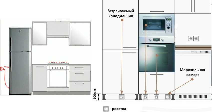Для встроенного холодильника идеальным местом для розетки станет соседний шкафчик. В идеале, высота установки должна быть в пределах 20-75 см от пола, а расстояние от самого прибора 10-20 см.