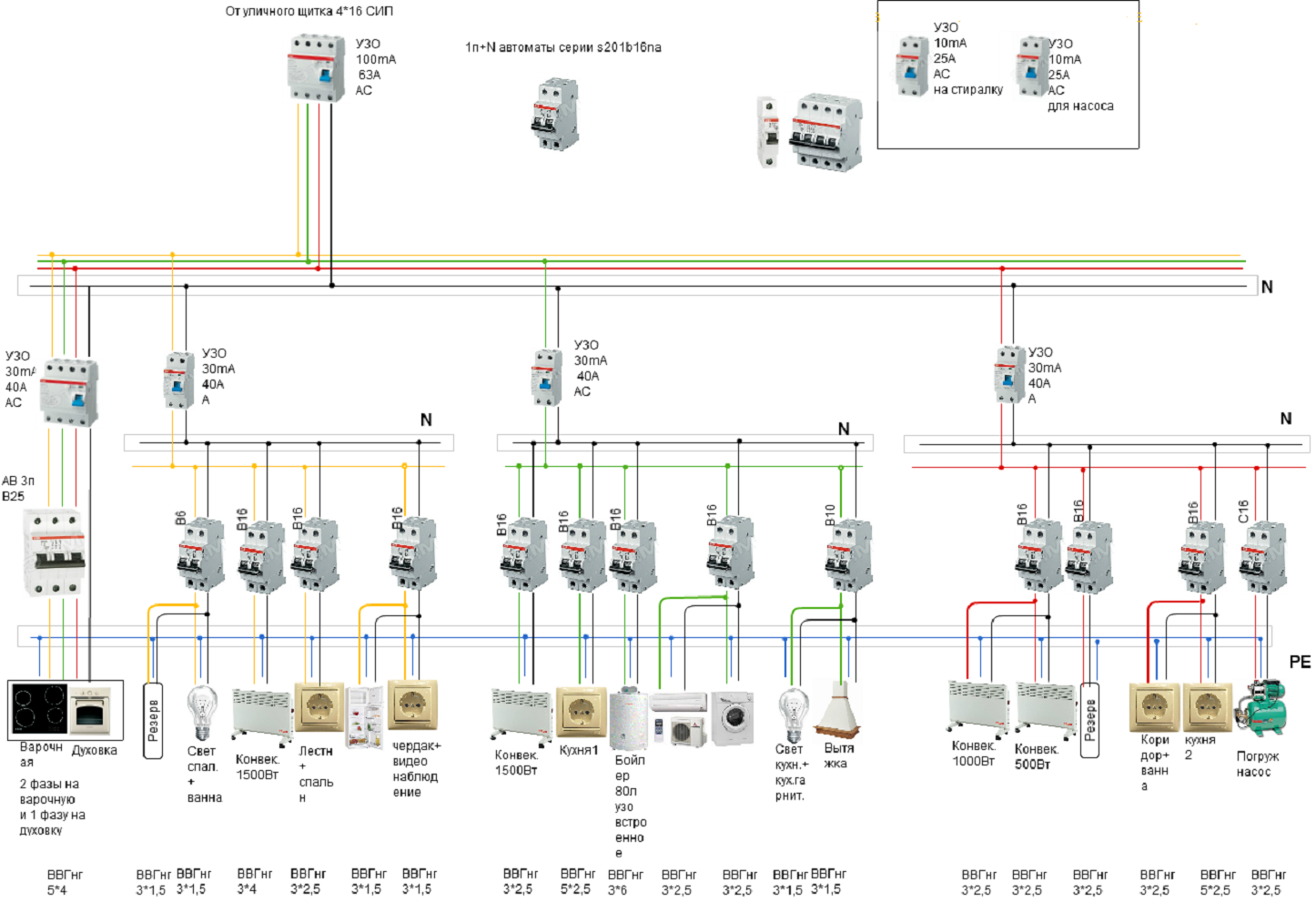 - Желательно включить на схеме УЗО на 30 мА на входе в квартиру и на 10 мА в ванной комнате, для защиты от удара током.