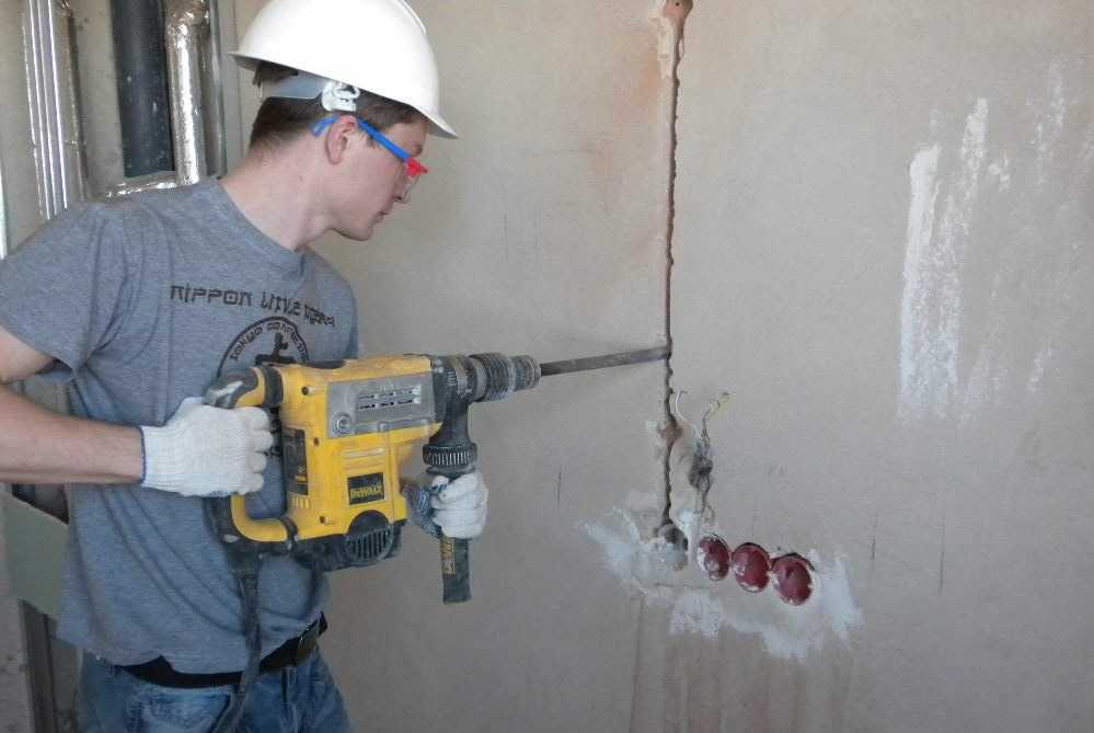 По разметке штробятся углубления с помощью болгарки и зубила или специального штробореза, делаются выемки для распределительных коробок и розеток с выключателями. Для этого потребуется перфоратор со специальными коронками-фрезами по бетону. Это самая трудоемкая часть ремонта, поэтому если вы сомневаетесь в своих силах или у вас нет нужного инструмента, лучше доверить работы специалистам.