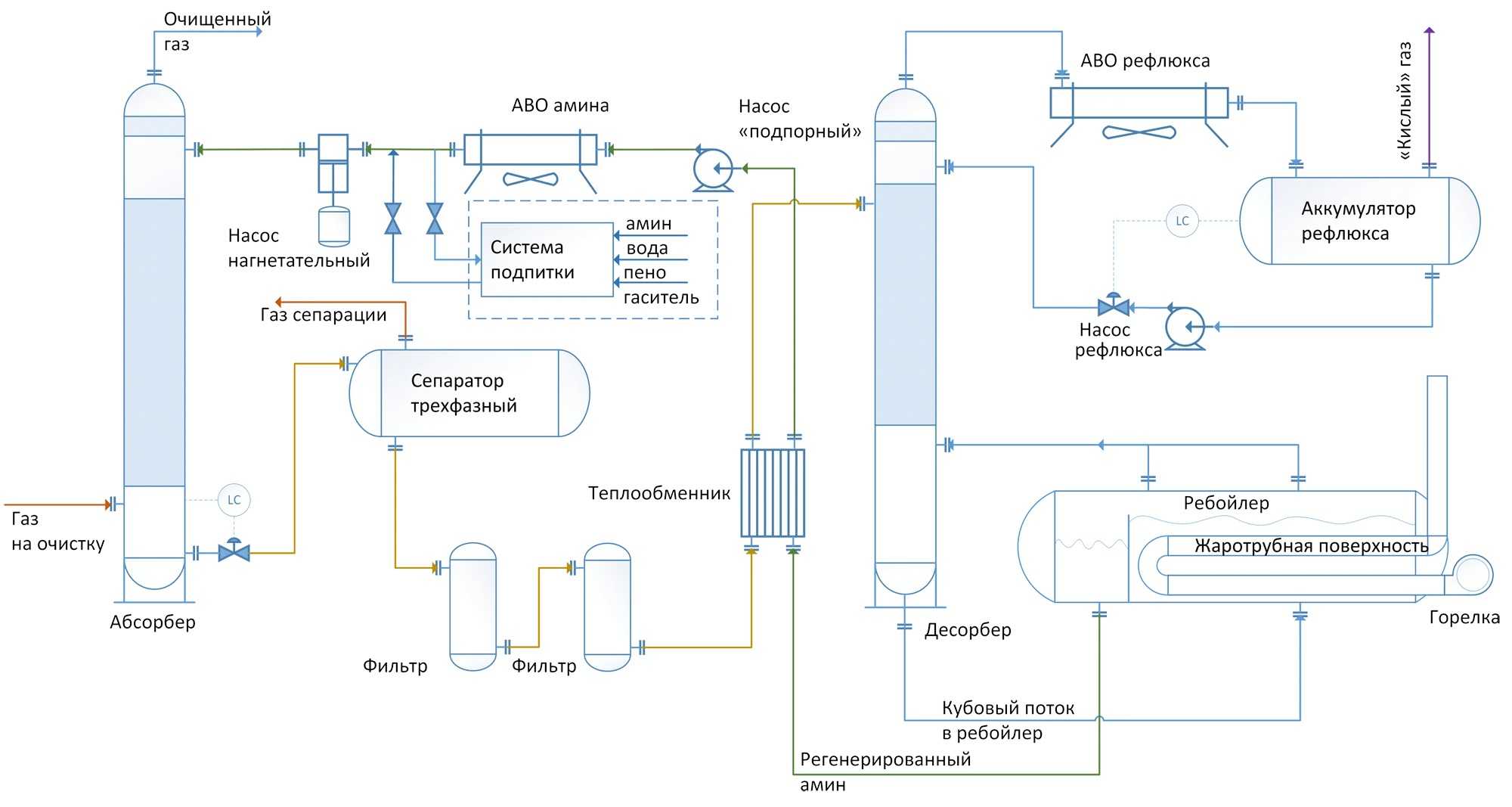 Кислый газ, подаваемый на очистку, поступает в нижнюю часть абсорбера. Этот аппарат обычно содержит от 20 до 24 тарелок, но для небольших установок это может быть колонна, оснащенная насадкой. Водный раствор амина поступает в верхнюю часть абсорбера. По мере того как раствор стекает по тарелкам вниз, он находится в контакте с кислым газом, поскольку газ движется вверх через слой жидкости на каждой тарелке. Когда газ достигает верхней части сосуда, практически весь H2S и, в зависимости от используемого абсорбента, весь CO2 удаляются из потока газа. Очищенный газ соответствует спецификациям по содержанию H2S, CO2, общей сере.