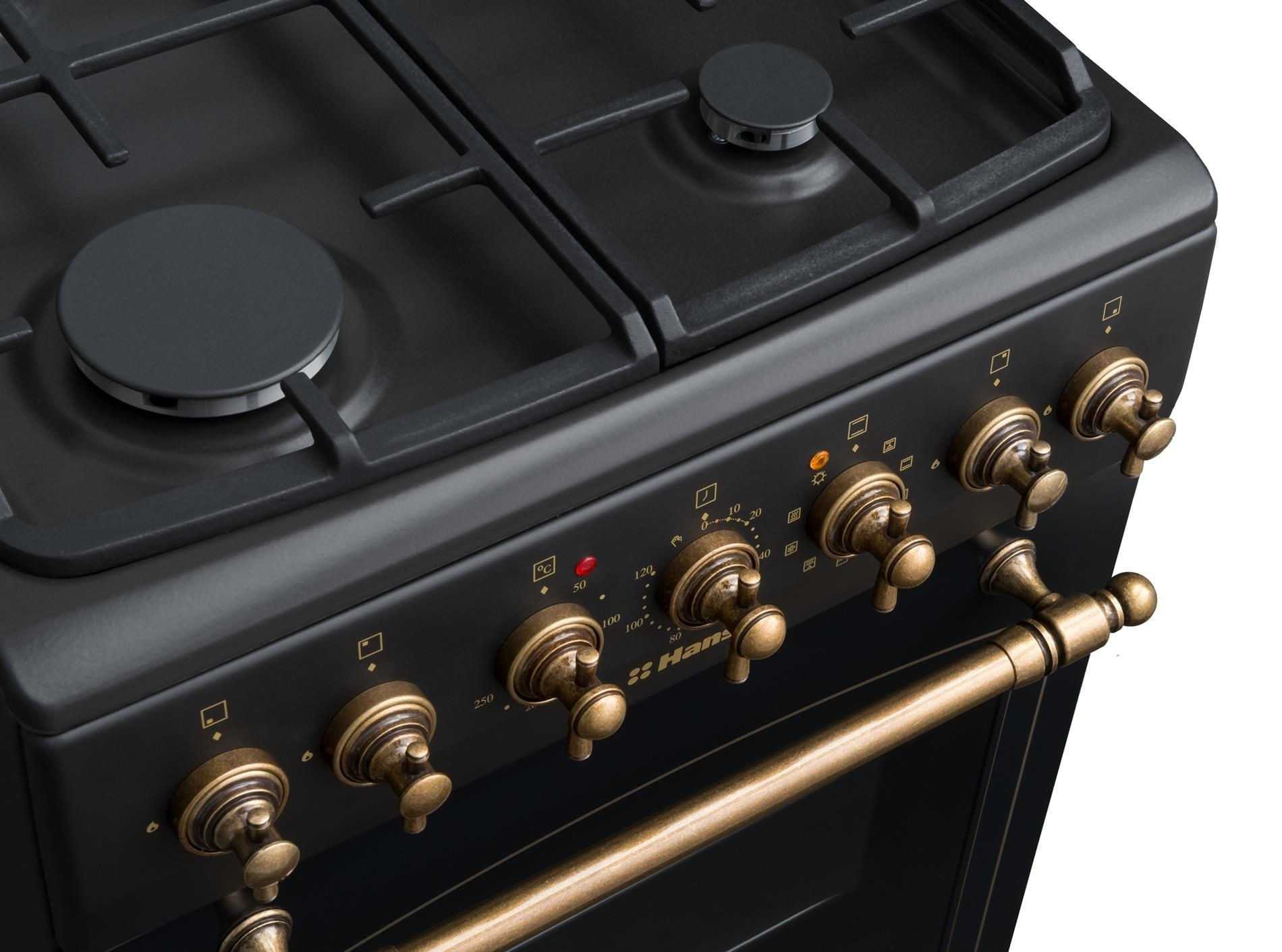 Дизайн комбинированной газово-электрической плиты выполнена в ретро-стиле. Рабочая поверхность окрашена темной эмалью. Стилизованные ручки имеют встроенную функцию электроподжига. Лучшая газовая плита с электрической духовкой оснащена таймером с функцией остановки работы. Гриль и конвекция обеспечивают быстрое равномерное прогревание пищи. В комплекте продаются 2 противня с покрытием ProCook не позволят блюдам подгореть.