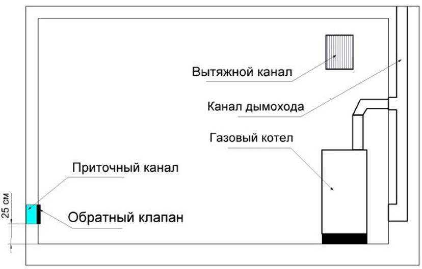 Для обеспечения безопасной и экономичной работы газового котла обычно обустраивается вентиляция таких видов: