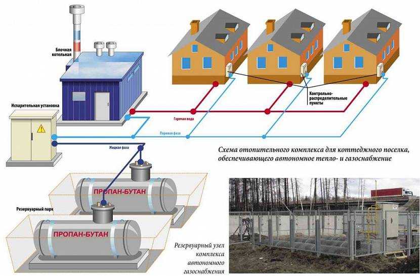 В тех загородных населенных пунктах, куда такие коммуникации не проведены, может производиться отопление домов газом в сжиженном состоянии (пропан-бутаном). В данном случае в качестве основного оборудования чаще всего также используются котлы особой конструкции. Сам газ для отопления, к примеру, небольших дачных домиков может храниться в баллонах. Жилые здания значительной площади отапливаются обычно топливом, подаваемым из газгольдера. Такие конструкции размещаются под землей.