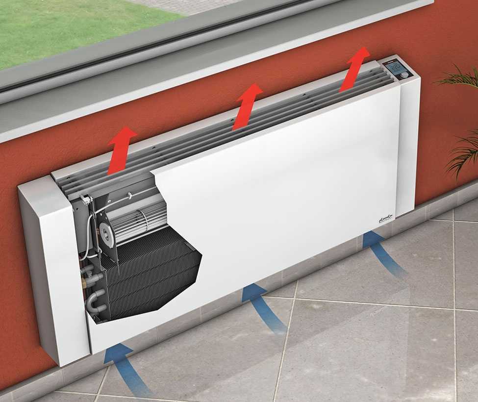 Конвекторы представляют собой нагревающиеся панели, они отапливают пространство с помощью движения холодных и теплых воздушных масс. В состав конвектора входит труба, в которой расположен теплоноситель. Труба обрамляется ребрами, пластинами которые подогревают окружающее пространство. Изготавливаются пластины зачастую из меди, либо стали. Конвекторы разделяются на внешние и встроенные. Первый тип конвекторов крепится на стену, второй может быть закреплен вдоль пола, либо стены. К конвекторам так же относятся теплые плинтусы. Данное устройство отличное решение для людей, которые не желают зависеть от систем государственного отопления.
