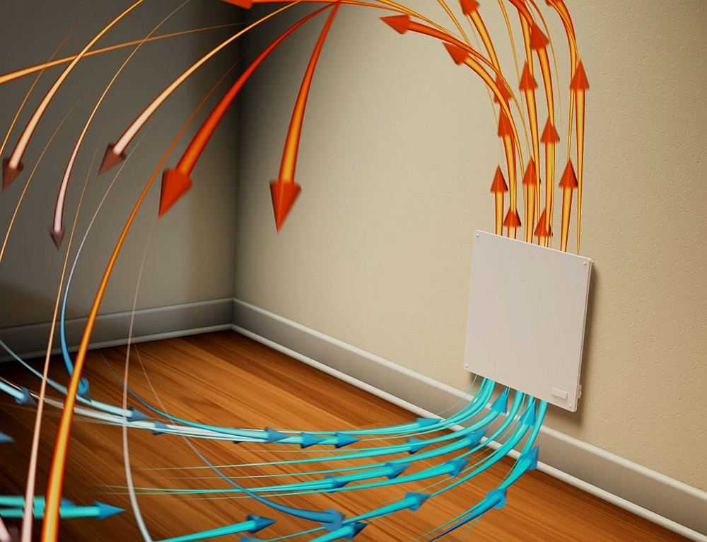 Основной элемент — конвектор. Обогрев конвекторами представляет собой аналог традиционных «батарей», монтаж которых осуществляется под окнами комнаты. На них подается напряжение, которое нагревает воздух. Теплые потоки уходят вверх, а холодные притягиваются снизу. Как итог — хороший цикл и микроклимат.