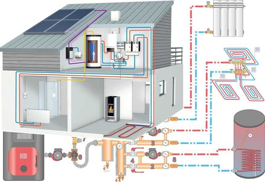 Это современные эффективные системы отопления способные отапливать дом любой этажности и площади с многоуровневыми контурами отопления зданий, работающие с разными режимами нагрева, например, традиционная радиаторная система с вариантом «теплый пол».