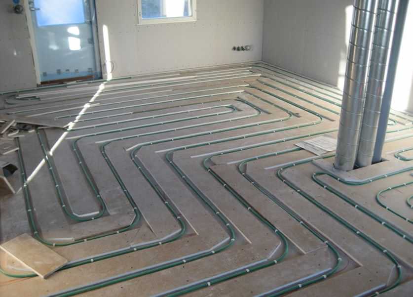 В деревянном коттедже стяжку выполняют сухим способом; нагревательные системы монтируют на досках, на поверхности из листов ГВЛ, которые укладывают между лагами.