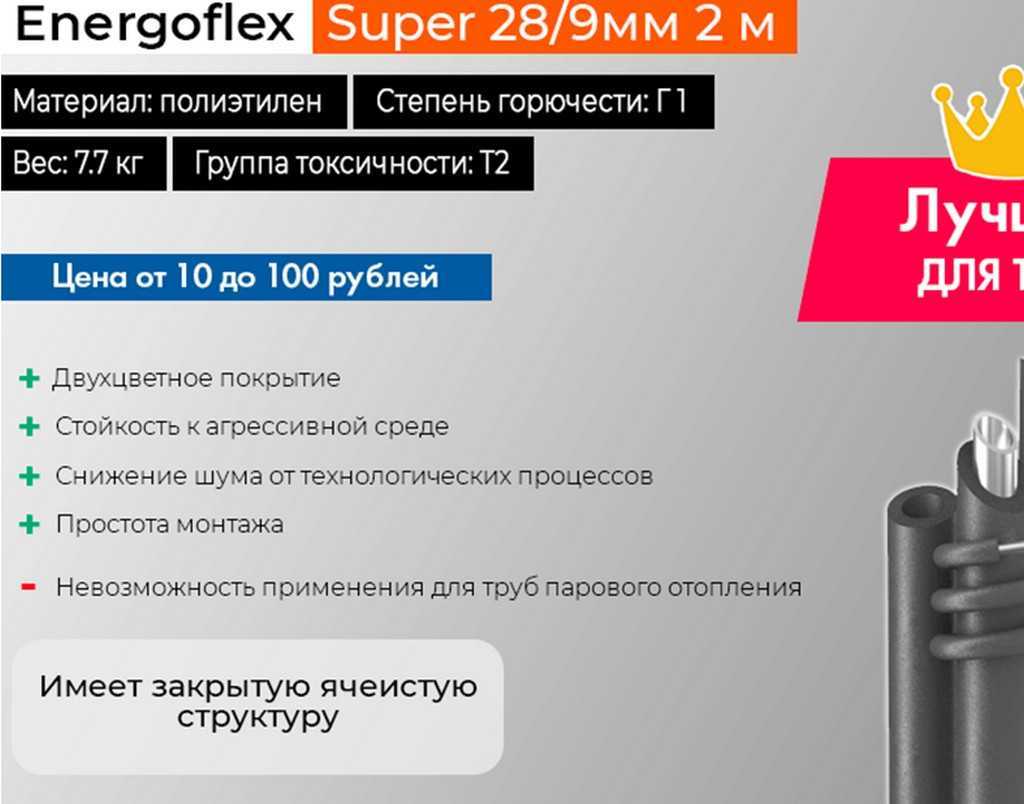 Energoflex Super – теплоизоляция для труб водяного отопления и горячего водоснабжения. Утеплитель выполнен из вспененного полиэтилена, имеет закрытую ячеистую структуру. Диаметр изделия внутри выполнен чуть больше внешнего сечения защищаемой трубы, что позволяет получить зазор на тепловое расширение. Кроме того, этот материал с легкостью монтируется в виде защиты поверх соединительных муфт.