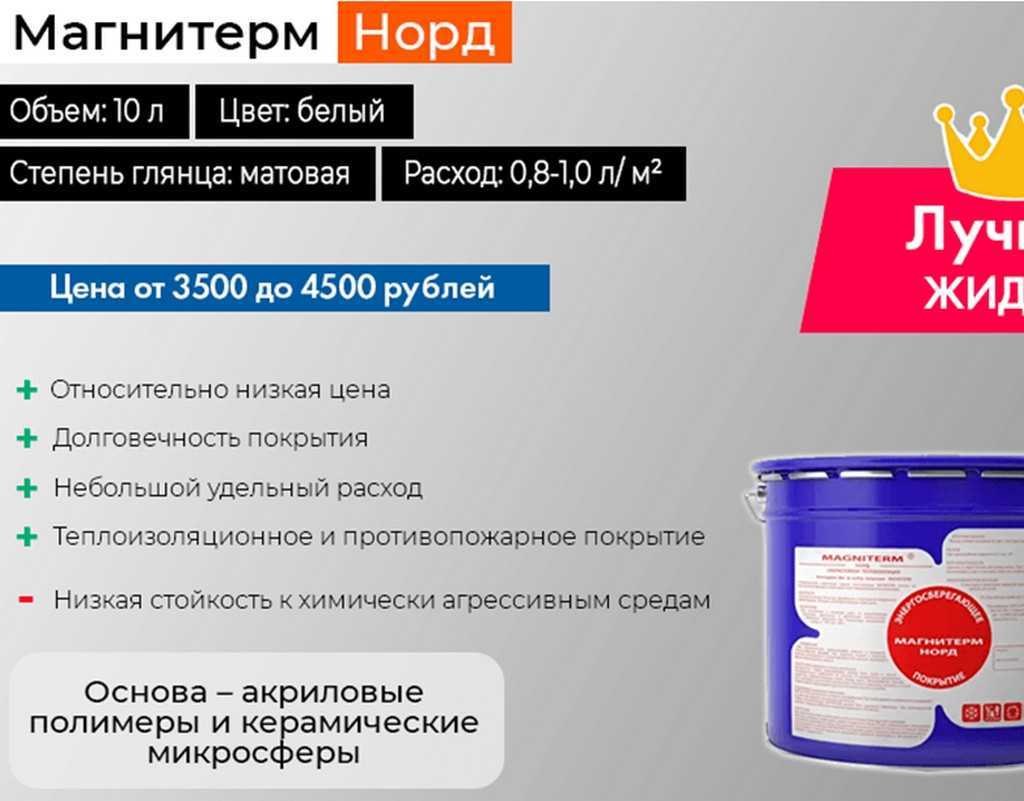 Пожалуй, одной из самых лучших теплоизоляций для дома можно назвать жидкую теплоизоляцию Броня Норд. Это отечественный утеплитель, созданный на основе внедрения импортозамещающих технологий. Можно сказать, материал будущего. Его основа – акриловые полимеры и керамические микросферы, еще есть добавки для улучшения потребительских качеств.