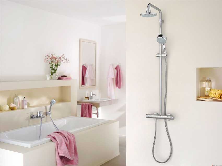 - Grohe считается самой недорогой, но в то же время качественной моделью. Эти конструкции производитель выпускает со смесителями и термостатом.
