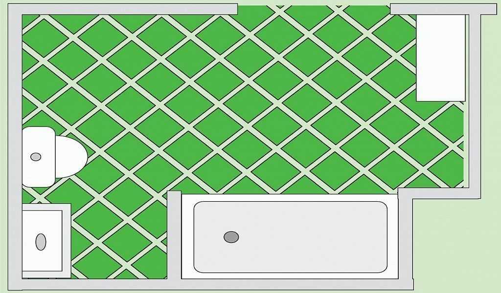 Базовый под углом : плитка выкладывается под углом (например, 45°) относительно стен. Рисунок выглядит интереснее, чем при базовом способе, укладка позволяет скрыть некоторую кривизну поверхности стен. Однако, при таком способе укладки расход плитки больше.
