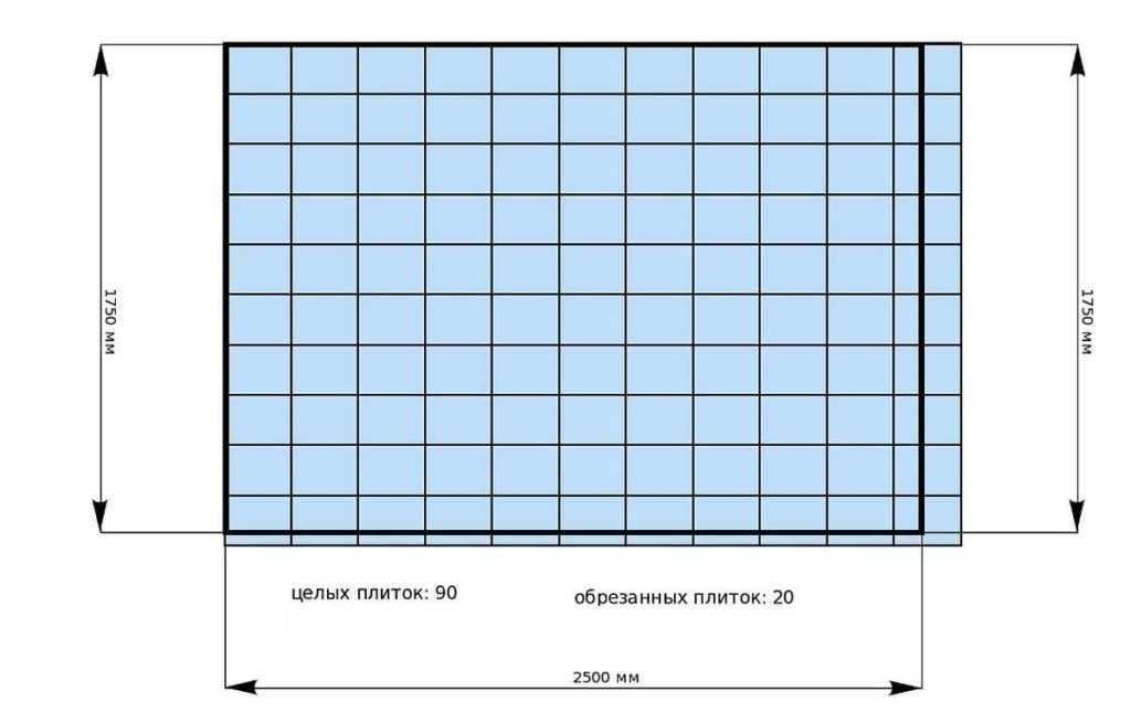 Теперь можно посчитать, что целых потребуется 90 штук (10 штук в длину на 9 рядов). Подрезанных — 11 в длину (10+1) + 9 на каждый ряд. Итого, обрезать надо будет 20 плиток кафеля.
