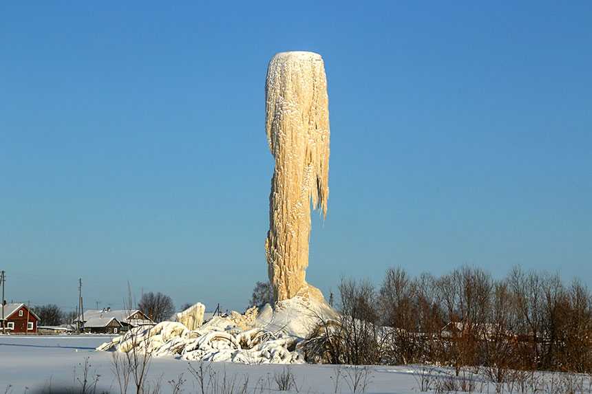 Если в резервуаре вода со ржавчиной, у сосулек получается «красивый» желтый цвет. Если же вода чистая, то сосульки будут небесно голубые, как в старых сказках о Снежной королеве.