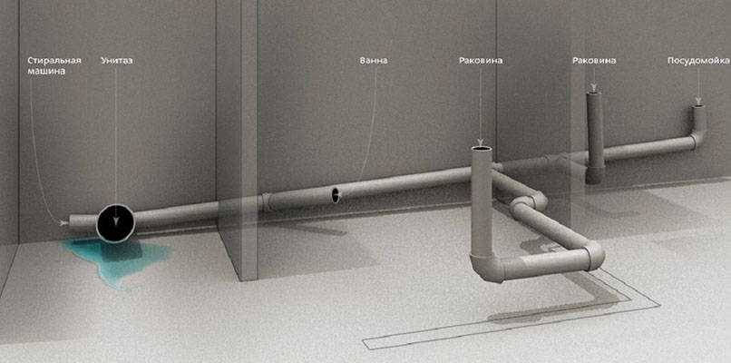 Если в цокольном этаже дома находится несколько точек водопользования, которые в сумме дают большое количество стоковых вод, то возможны два типа отвода: