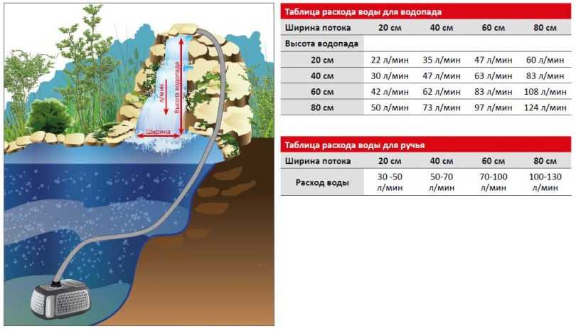 Если планируется, что одна помпа будет обеспечивать одновременную работу фонтана и водопада, необходимо предварительно выяснить, сможет ли она выдать разные значения давления. Для нормальной работоспособности фонтана требуется небольшой объём воды под большим давлением, а насос для водопада должен подавать большое количество воды с невысоким давлением.