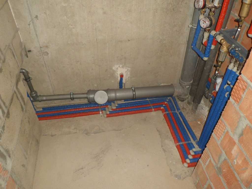 - Если основные трубы располагаются внизу над полом, водопроводные отводы через тройники, нужно провести перпендикулярно вверх.